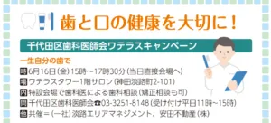 2023年6月16日は園医をしている千代田せいが保育園の歯科健診と千代田区歯科医師会ワテラスキャンペーン参加の為休診となります。よろしくお願い致します。