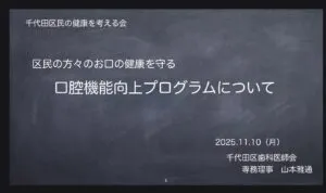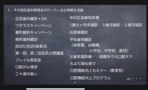 千代田区議会議員の先生方に区民の方々のために行なっている歯科関係の活動を説明…中でも口腔機能向上プログラムについて講演させて頂きました。